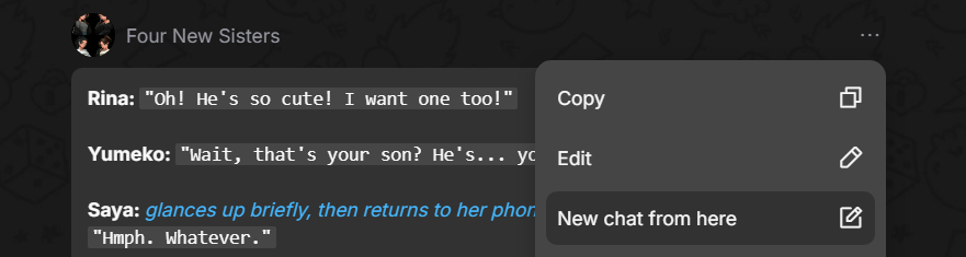 You can clone a chat from a selected message. This allows you to continue the dialogue in any direction without altering the original conversation. To do this, click the three dots above the message and select New chat from here. This will create a new chat including all messages up to the selected one.