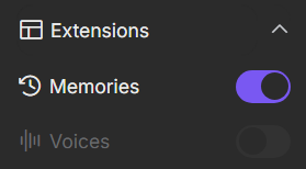 • To enable Memories, click Extensions in the site’s right-hand menu and activate the switch next to Memories.